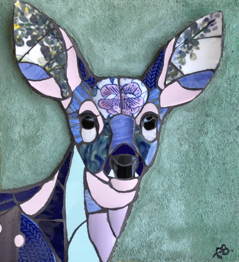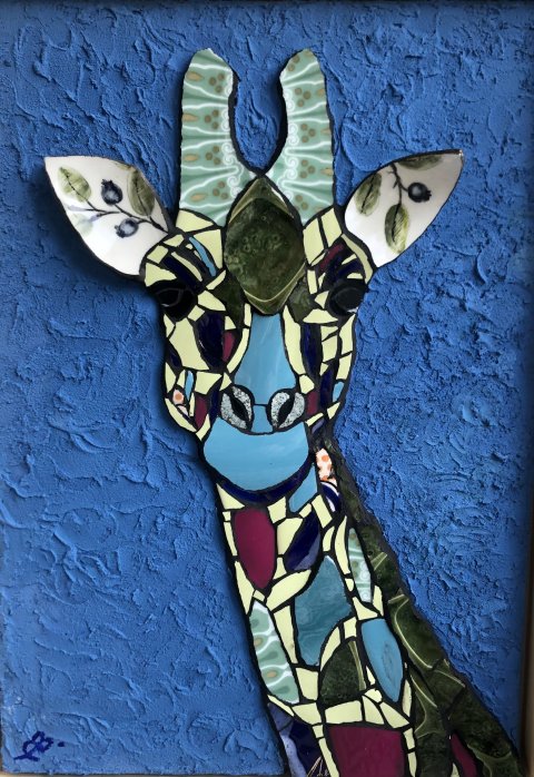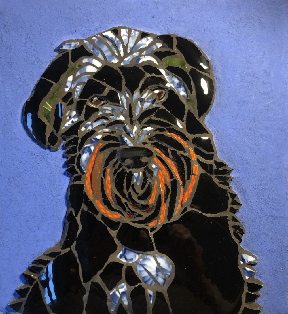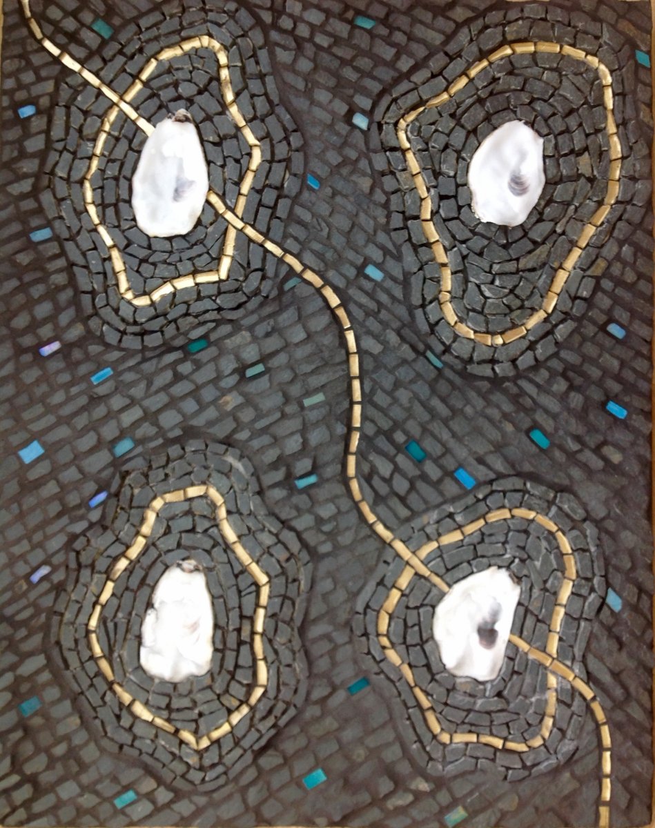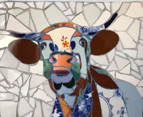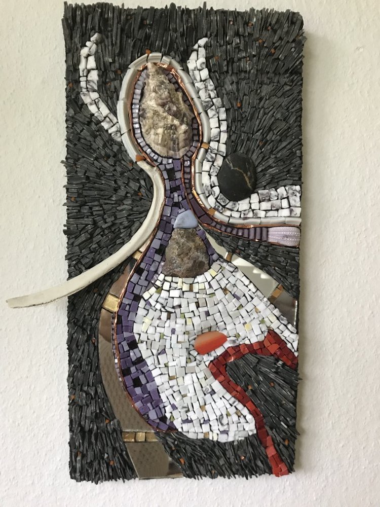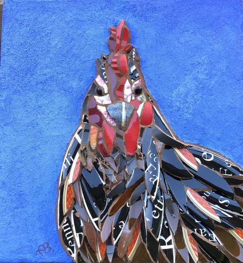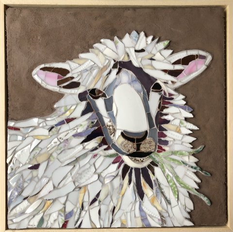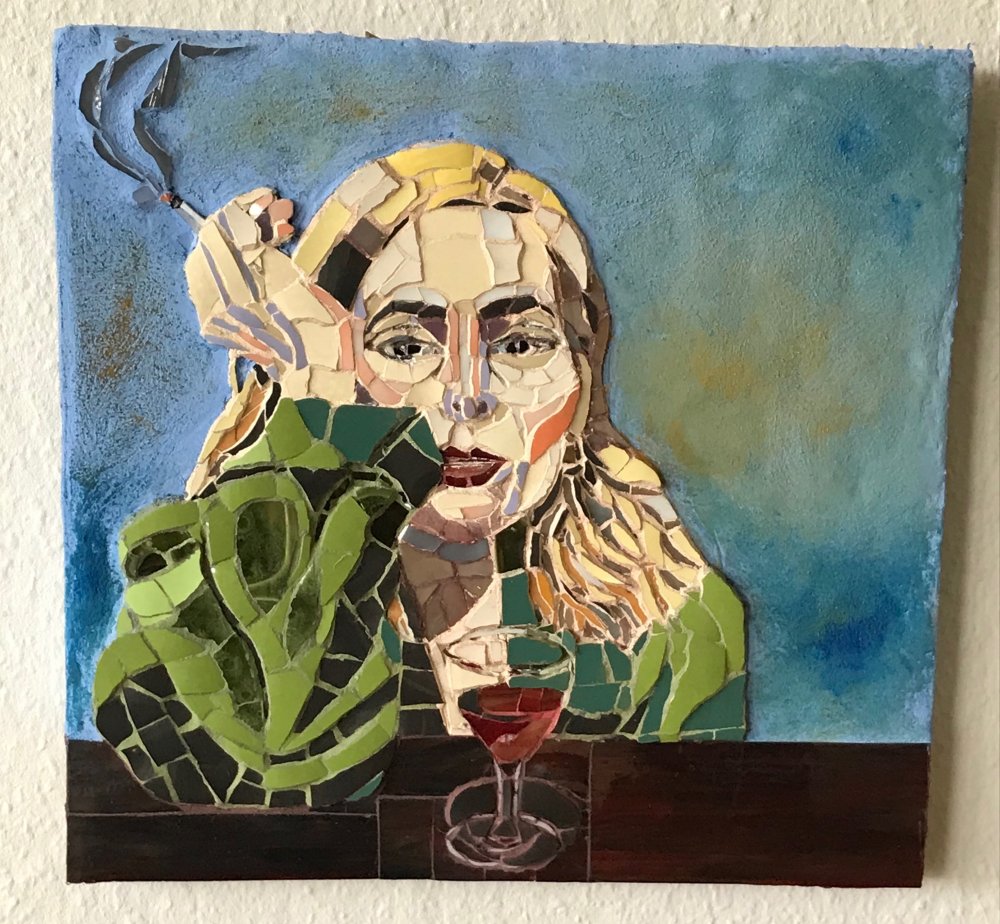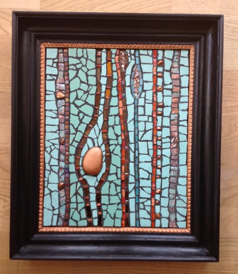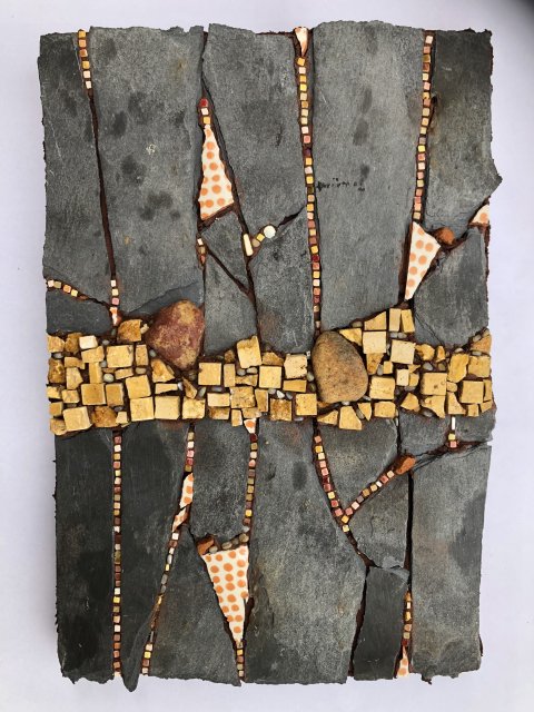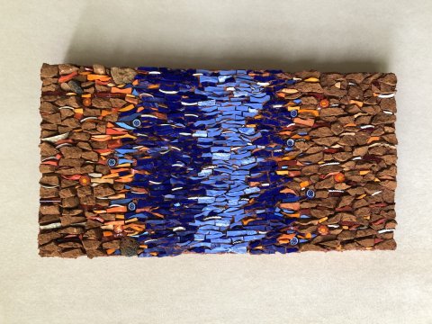 Celler, 2017. Billede i glas, fliser, sten og potteskår indrammet i sort og kobberfarvet [...]ramme. 30 x 39 cm. Solgt