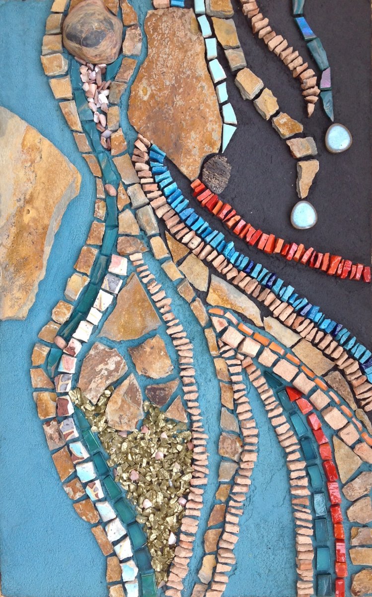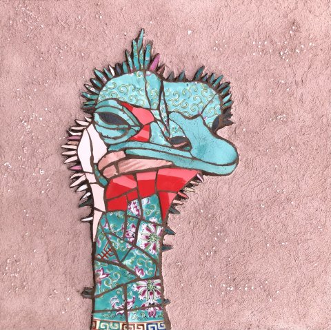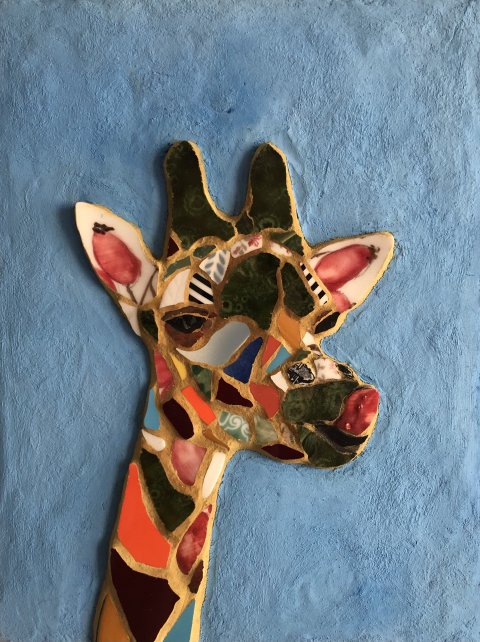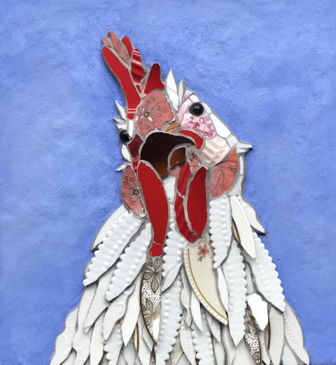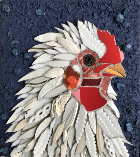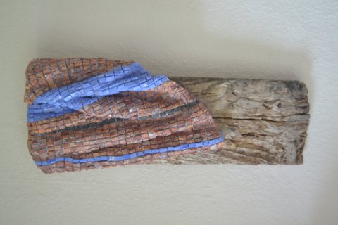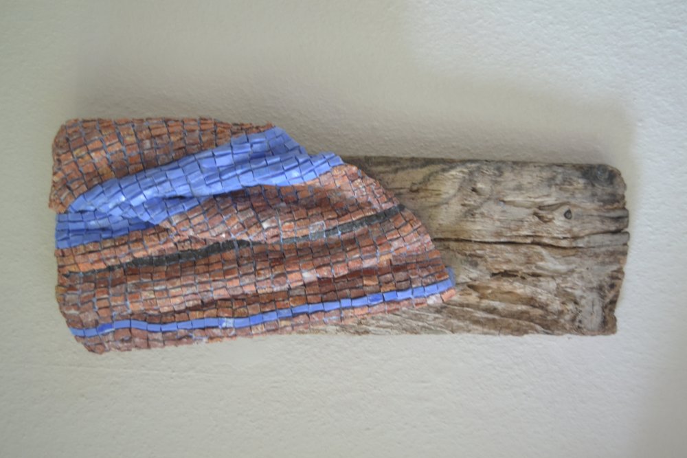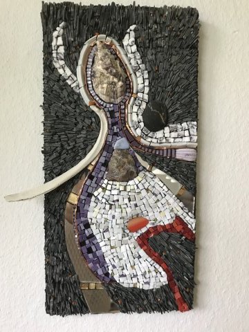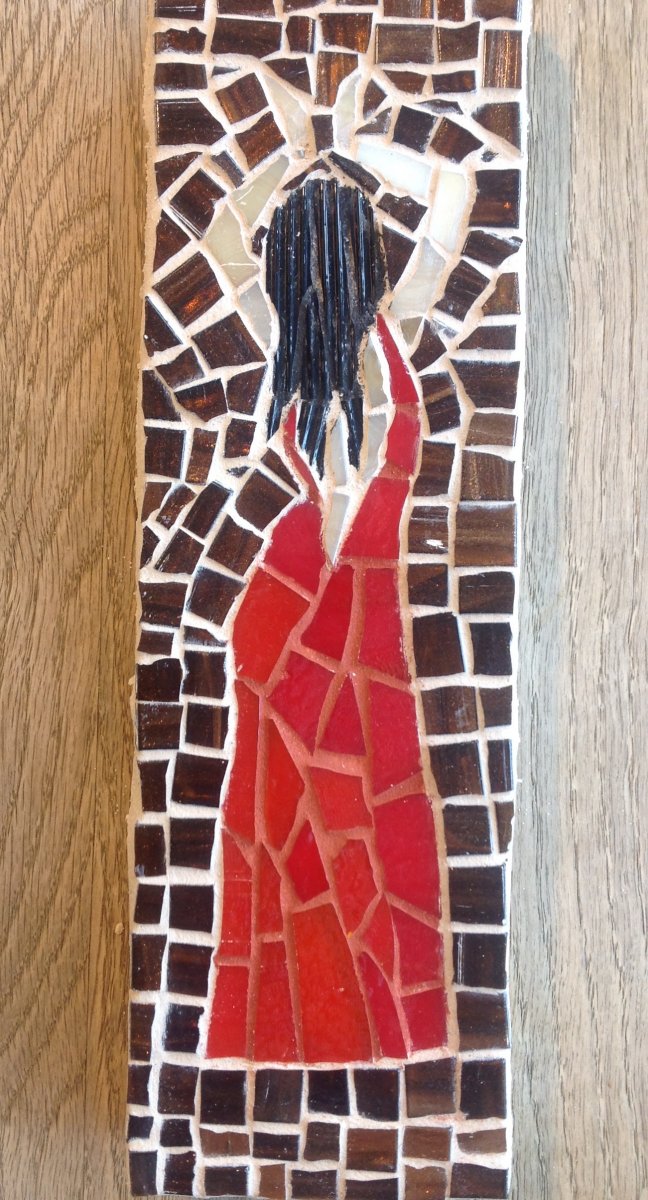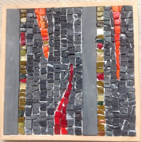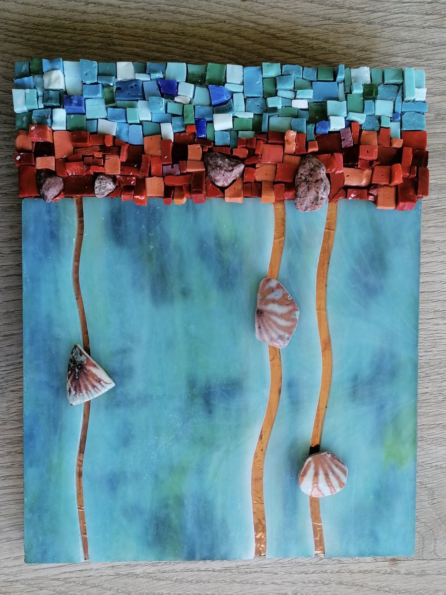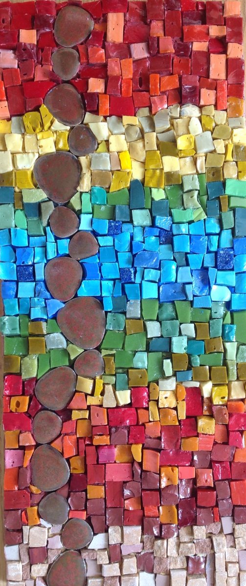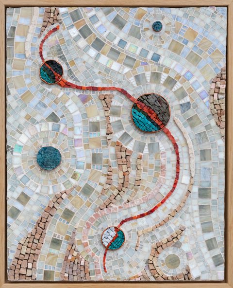 Den røde tråd, 2022. Mosaikbillede i glas, keramik, marmor og gamle mursten. 40 x 50 [...]cm. Pris: 8.900 kr