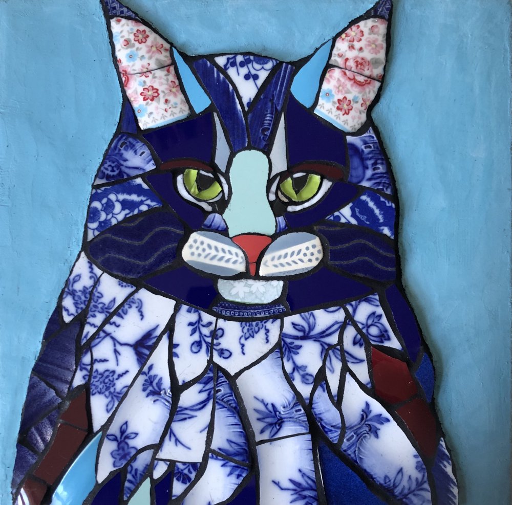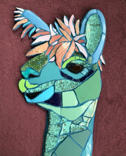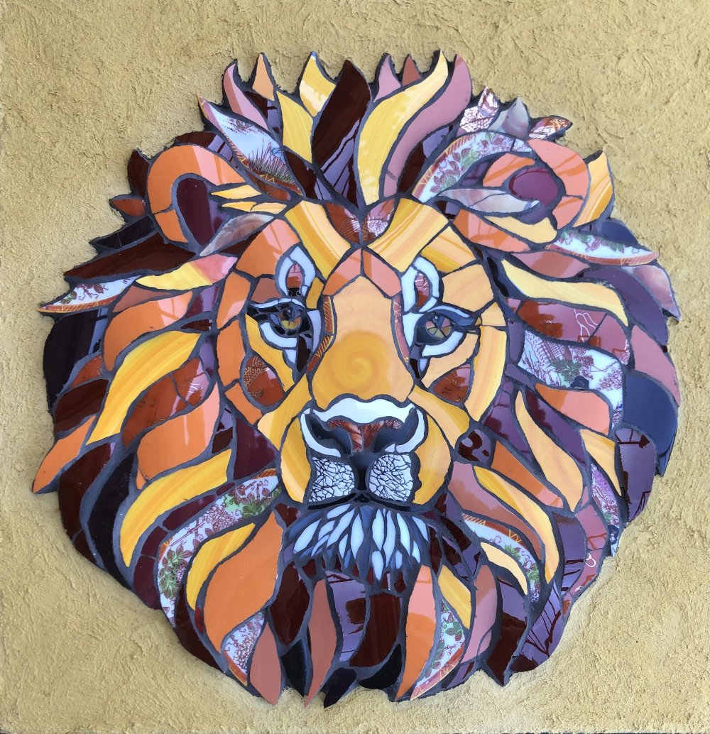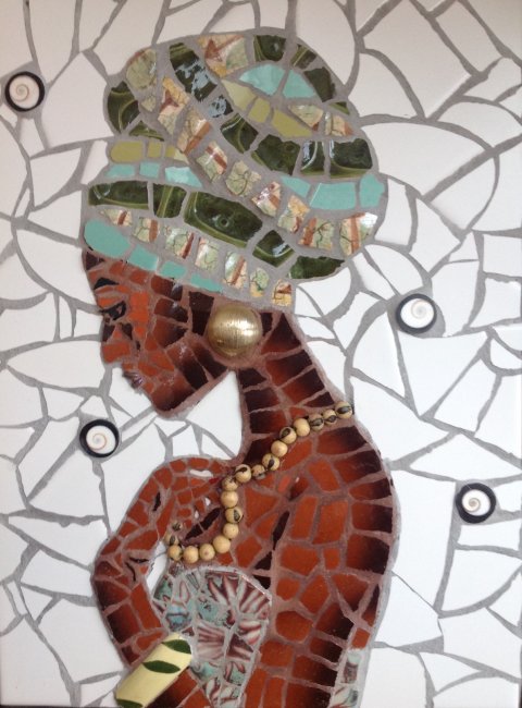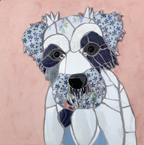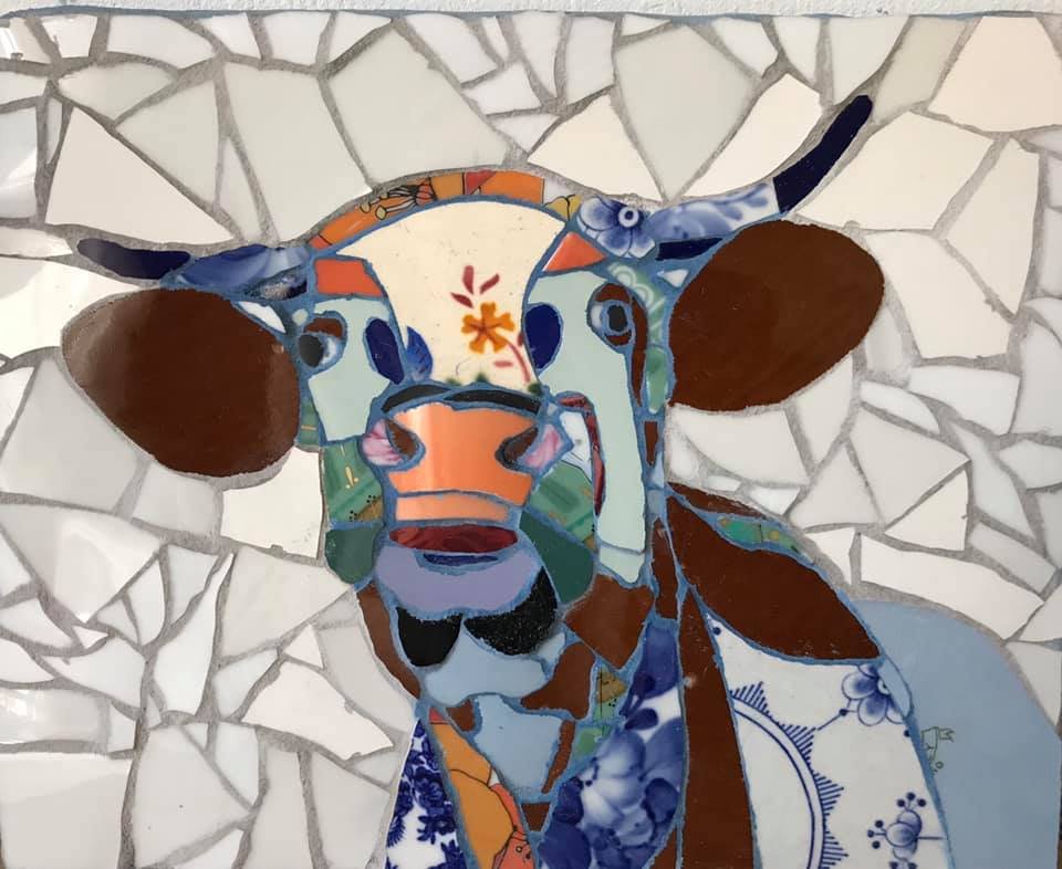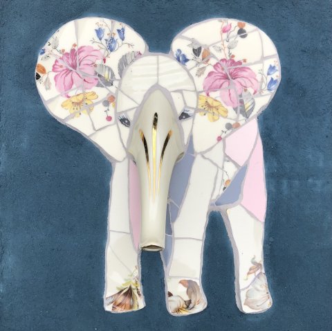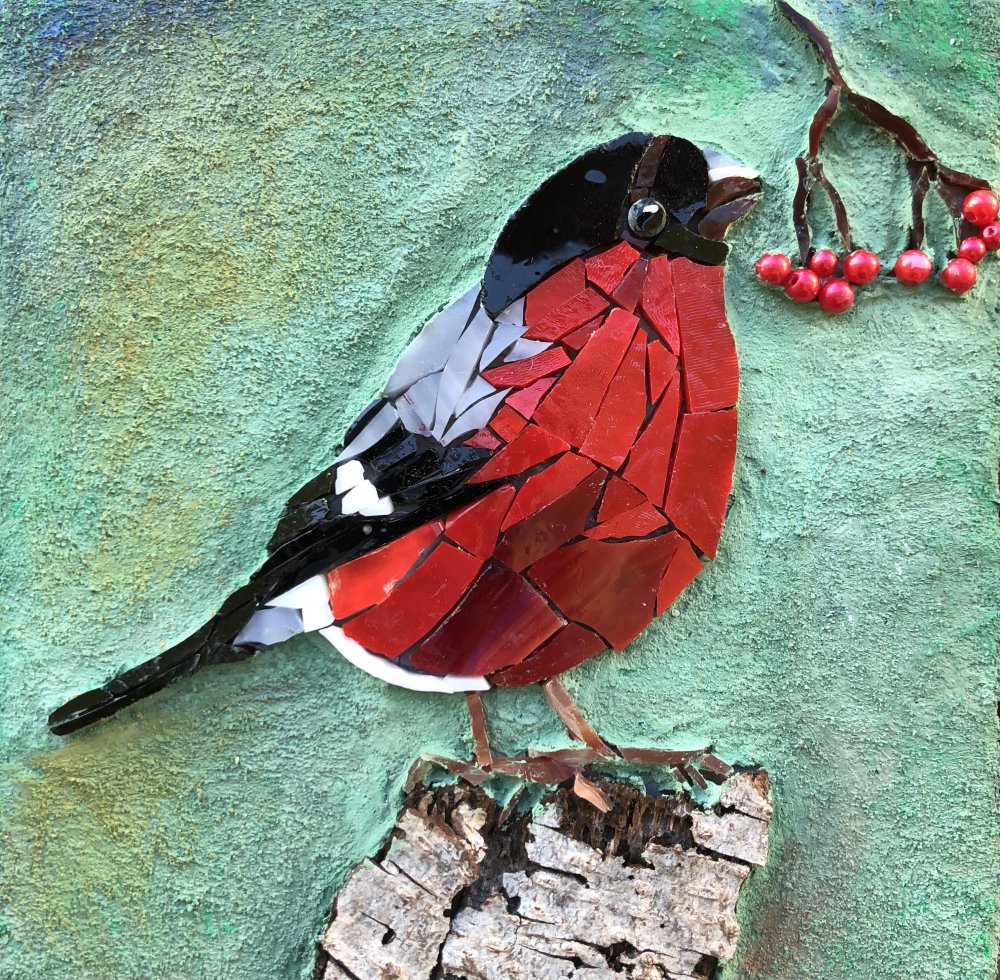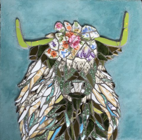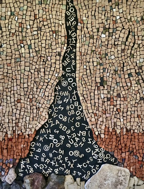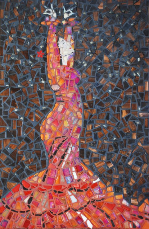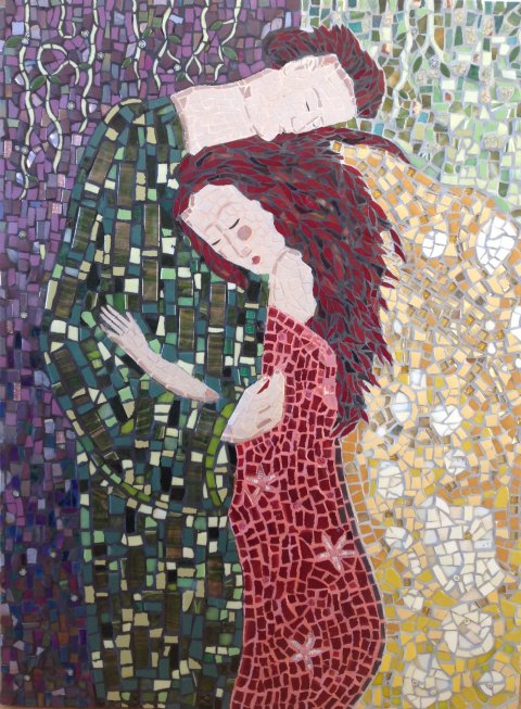 Den røde tråd, 2022. Mosaikbillede i glas, keramik, marmor og gamle mursten. 40 x 50 [...]cm. Pris: 8.900 kr