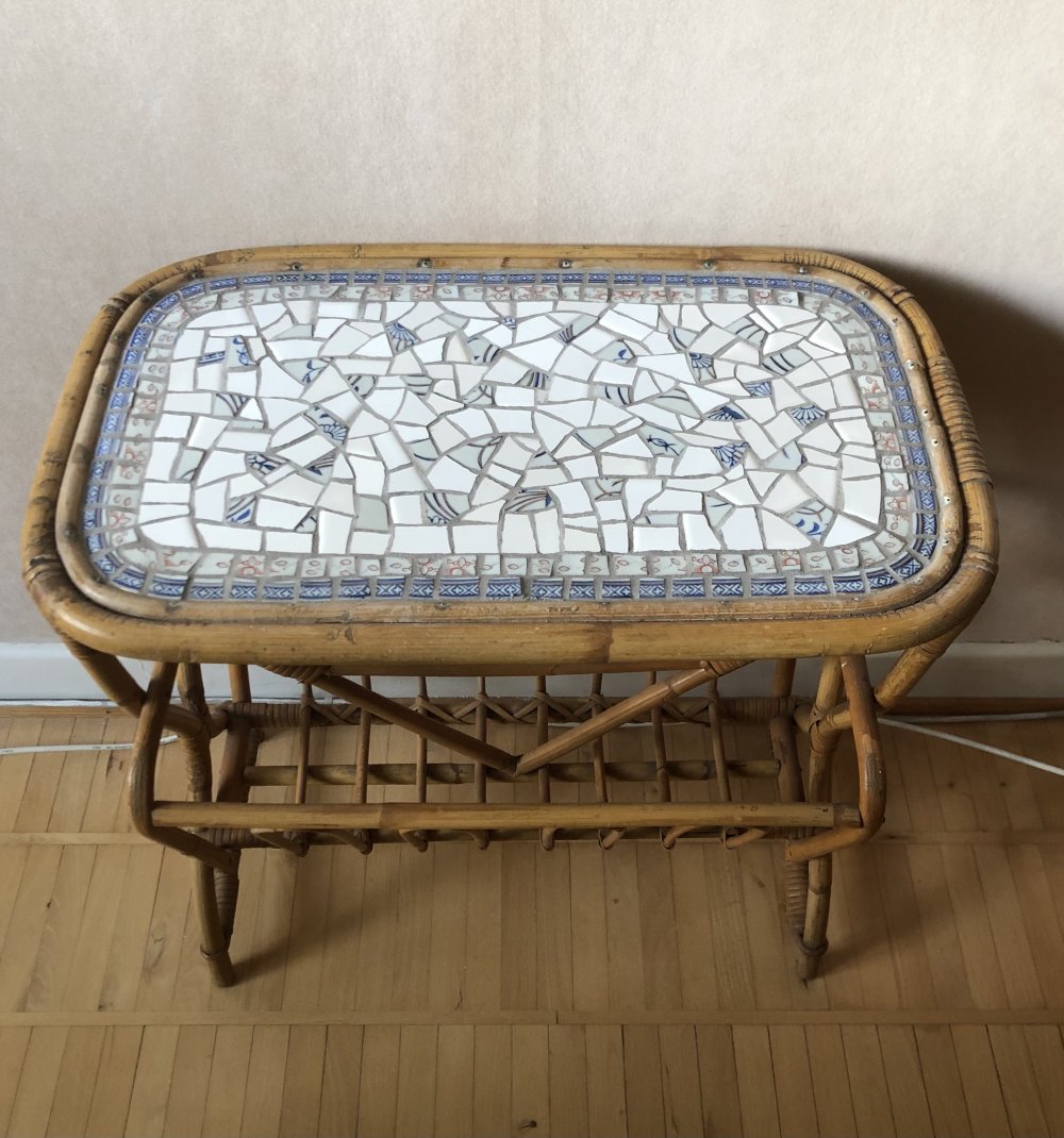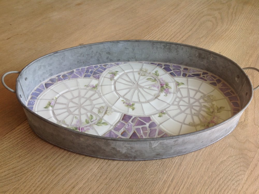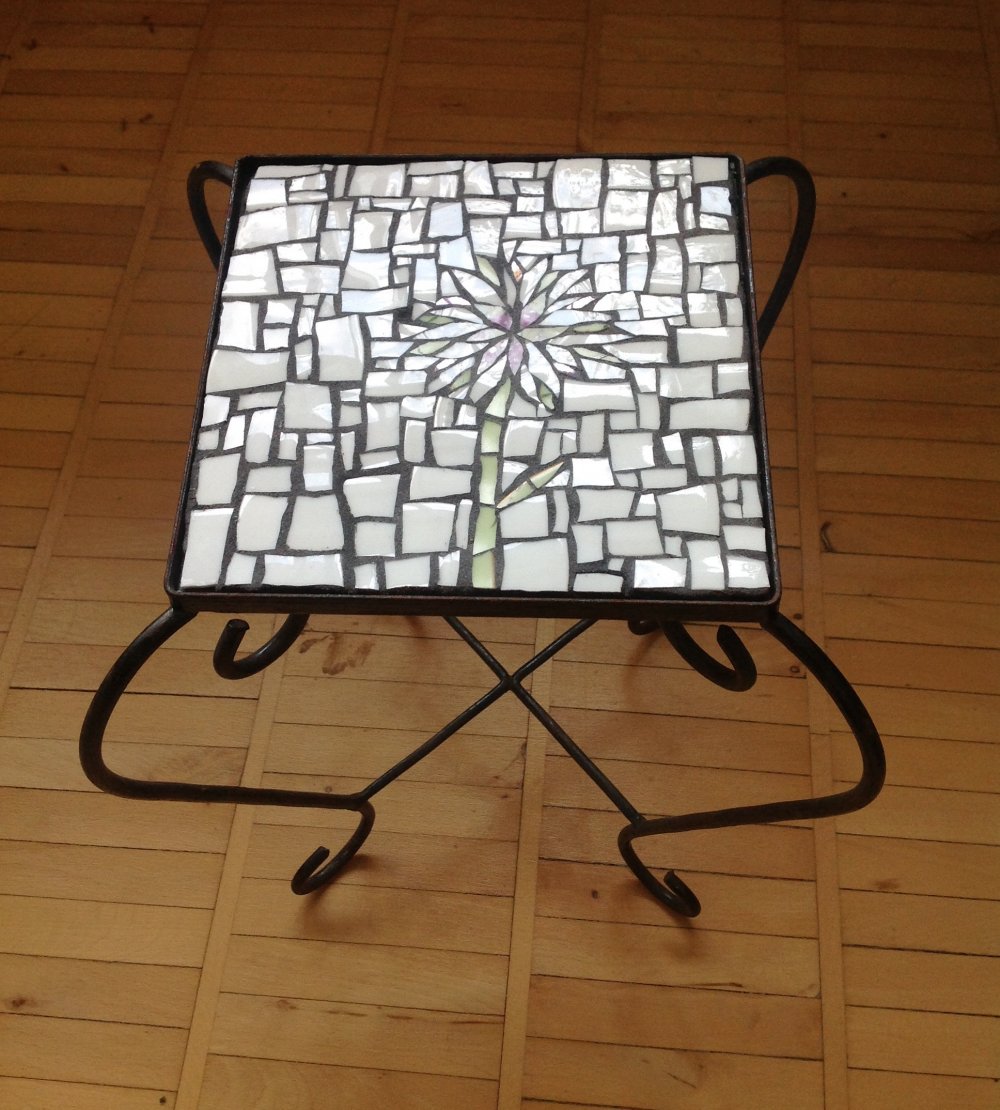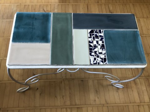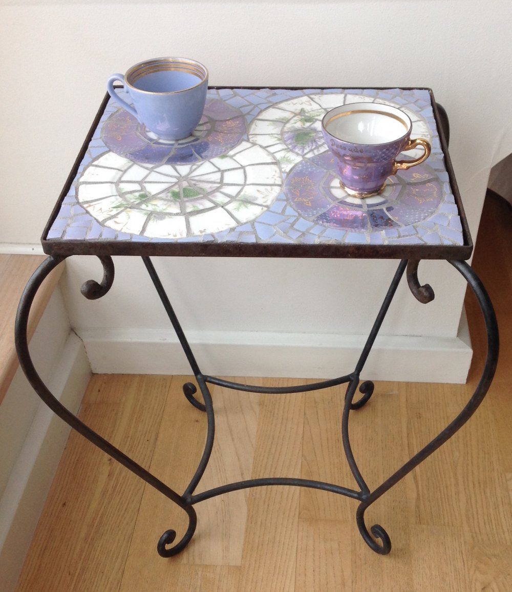 Blomsterbord i jern. Bordplade af porcelæn, løse mokkakopper. B26 x L30 x [...]H43 cm. Solgt