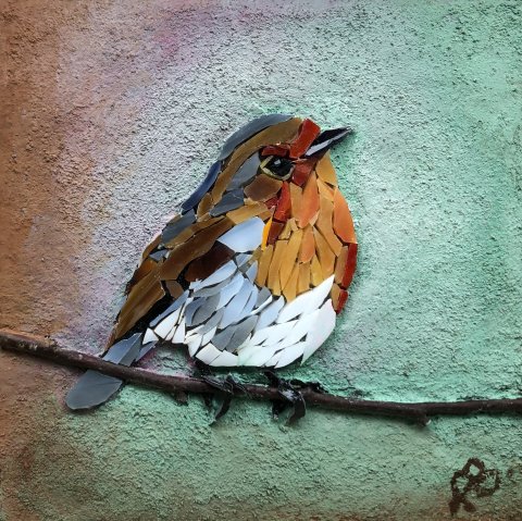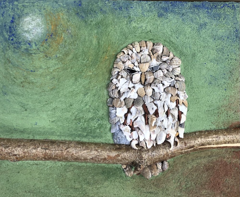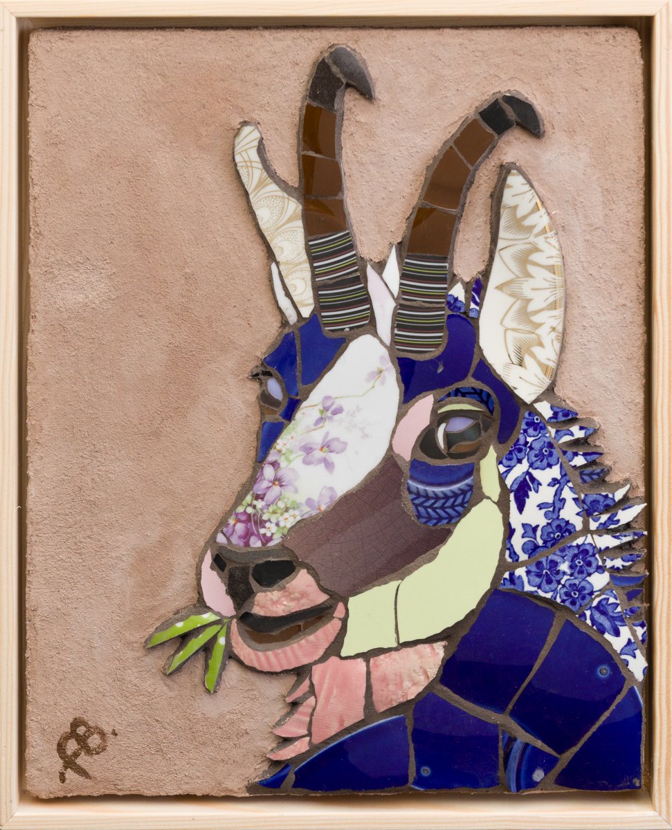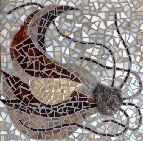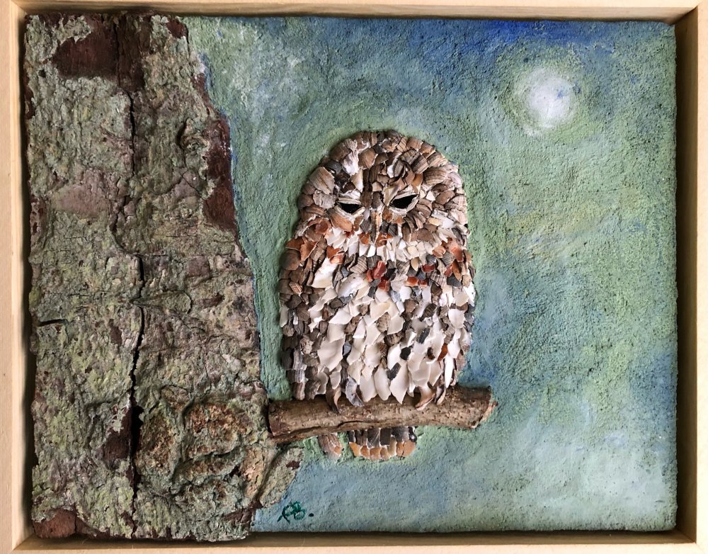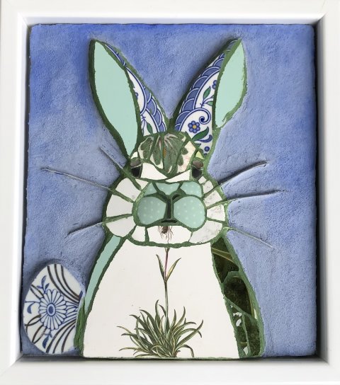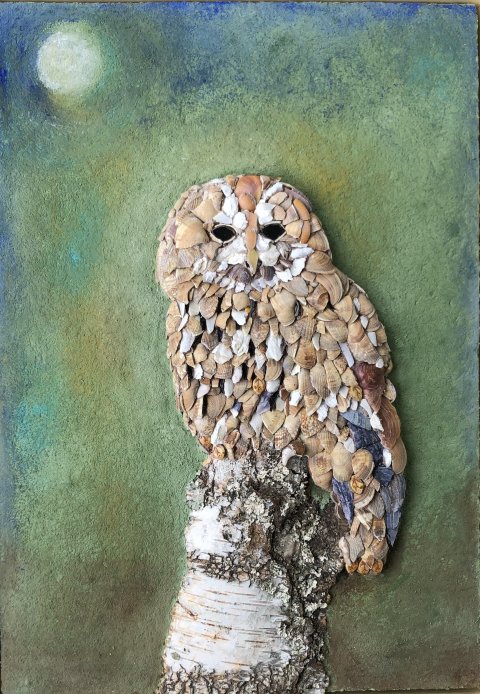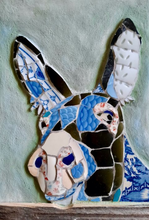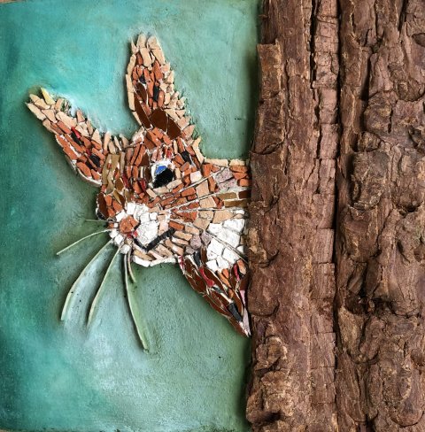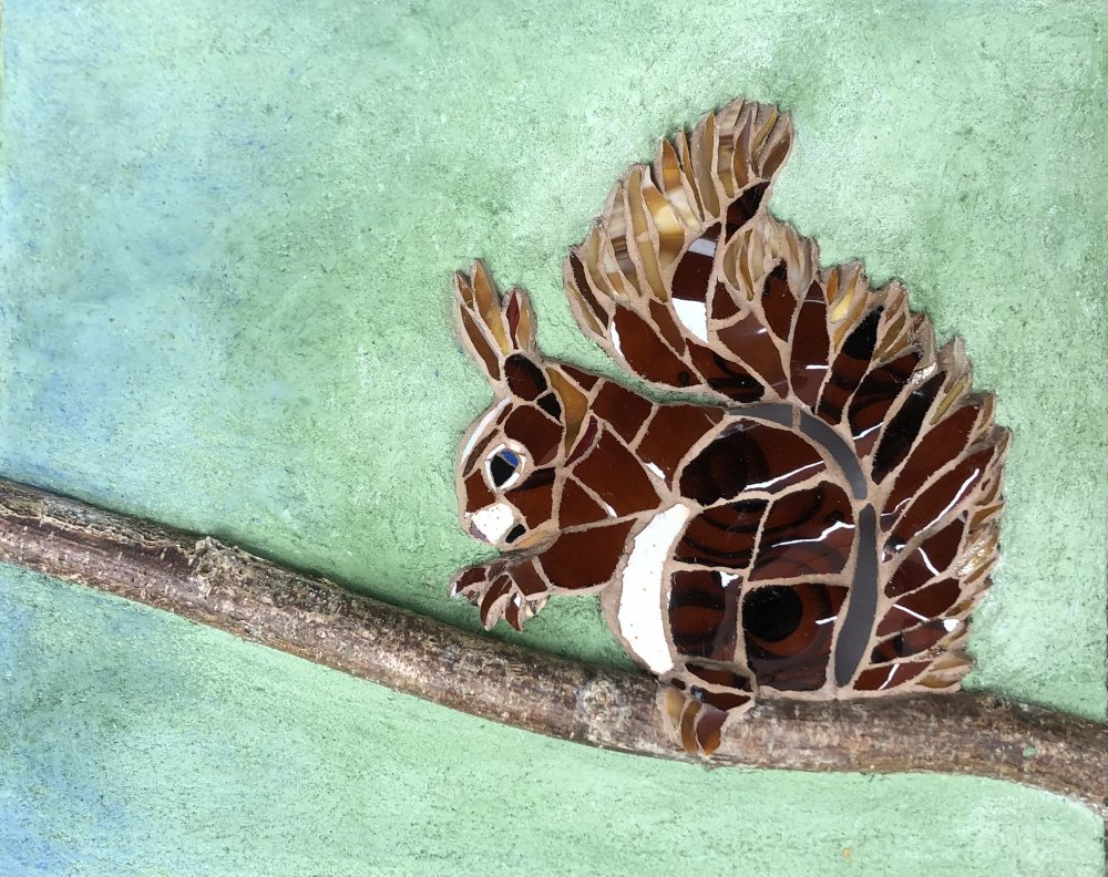 Egernet Ratatost (fra den nordiske mytologi), 2022. Billede i upcyclede mursten, porcelæn, strandsten, træ [...]og muslingeskaller. 20 x 20 cm. Solgt