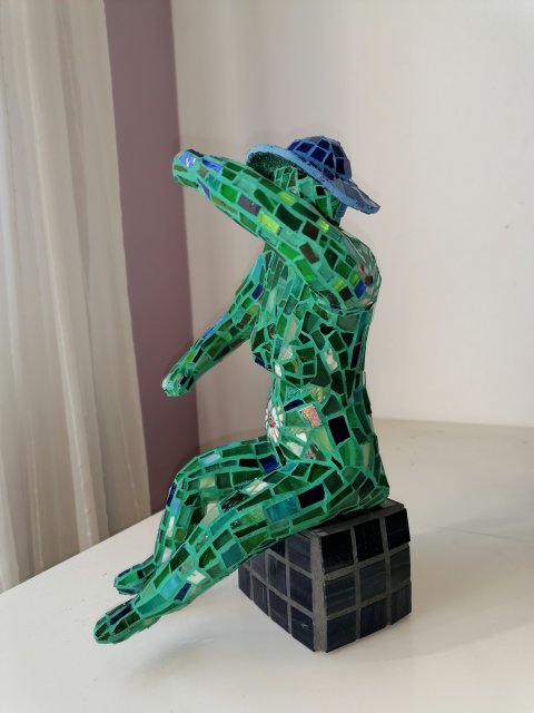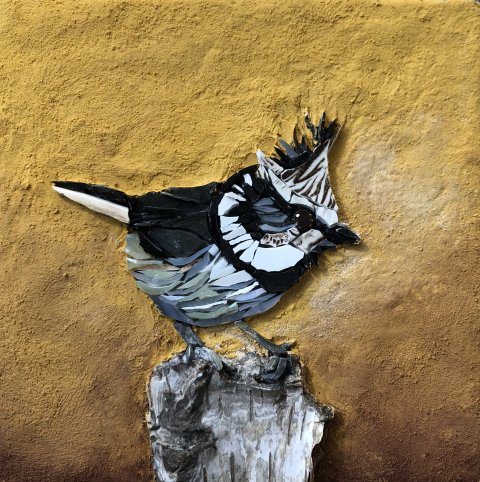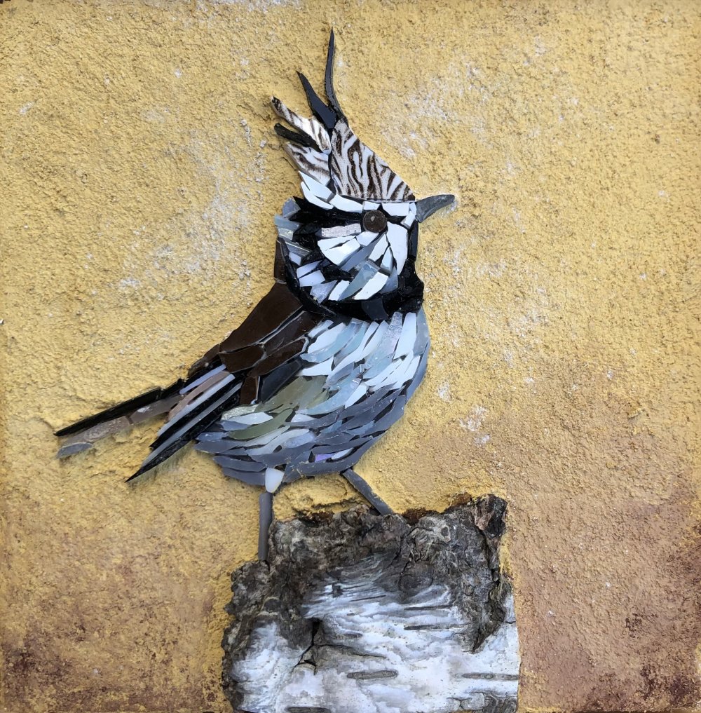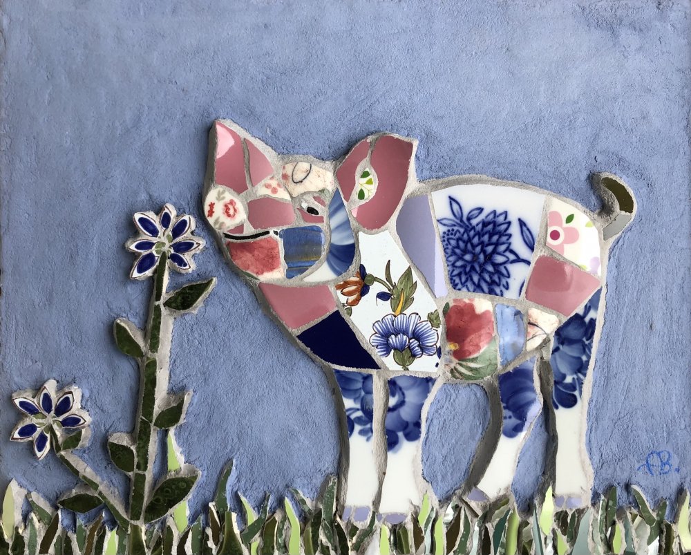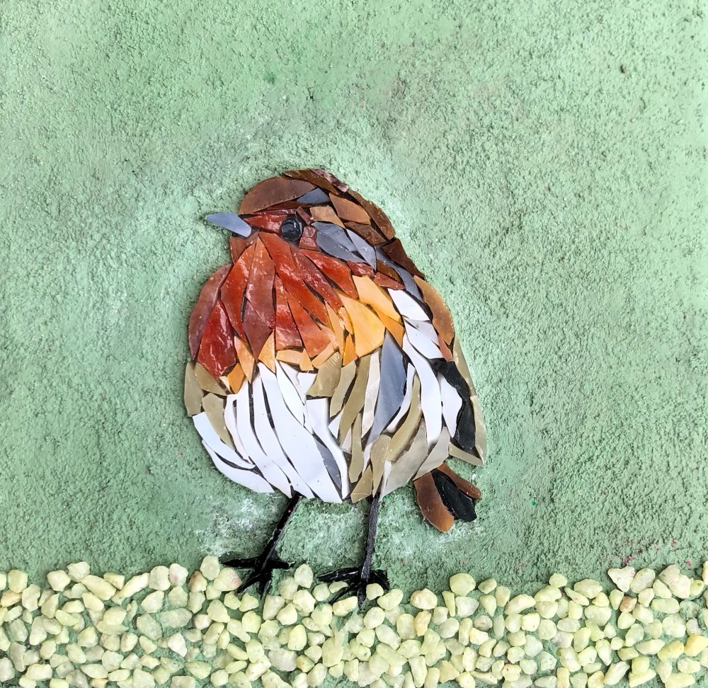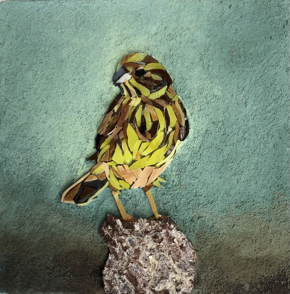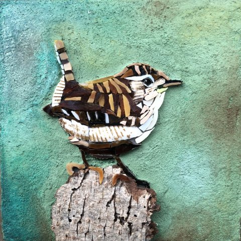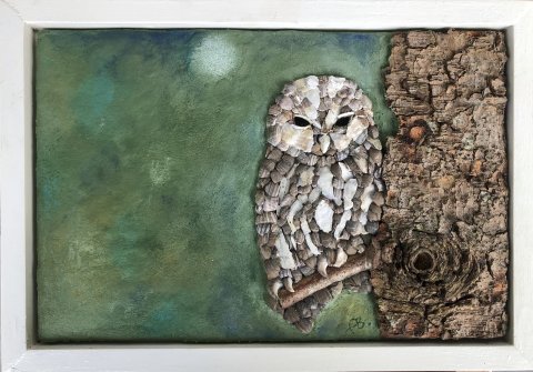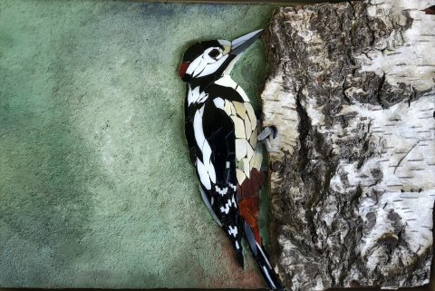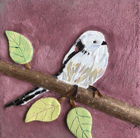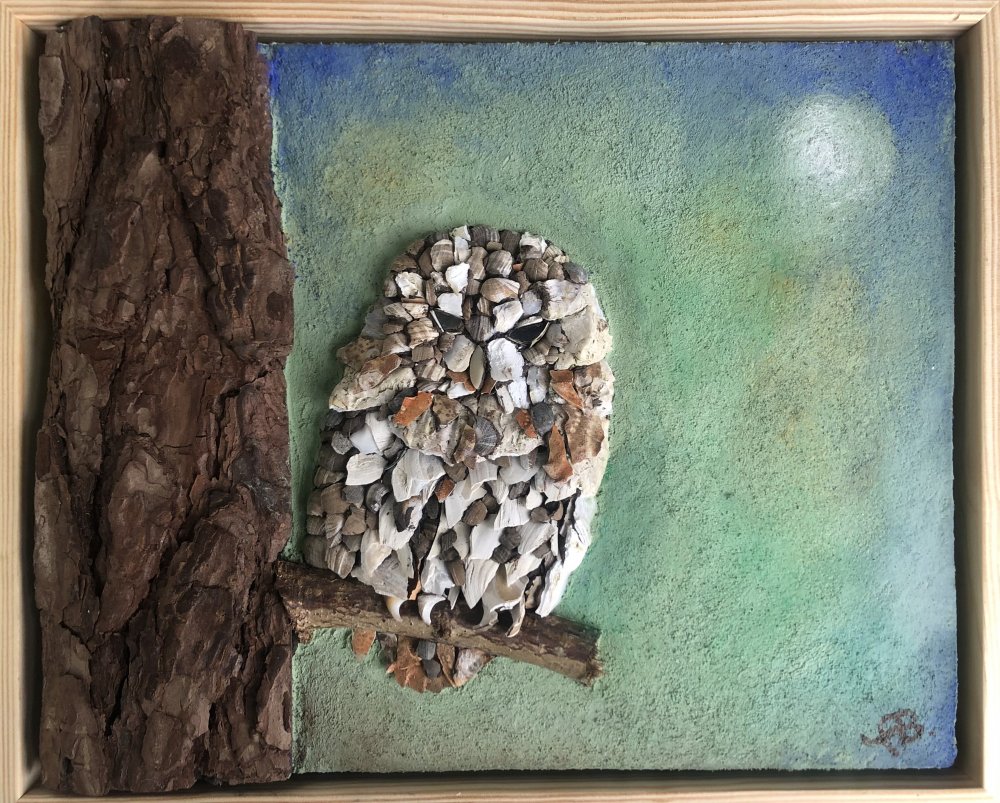 Egernet Ratatost (fra den nordiske mytologi), 2022. Billede i upcyclede mursten, porcelæn, strandsten, træ [...]og muslingeskaller. 20 x 20 cm. Solgt