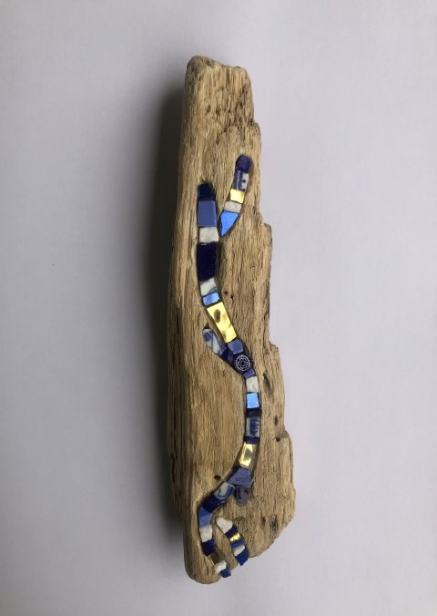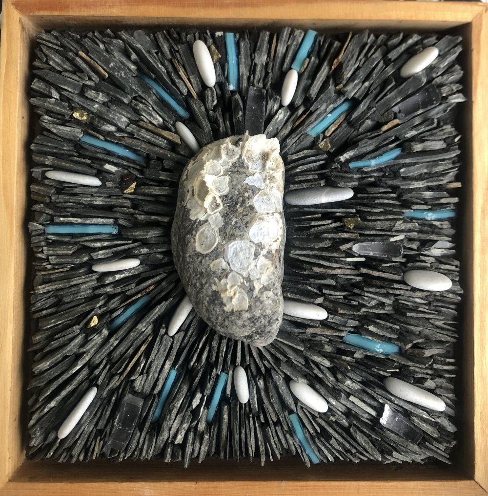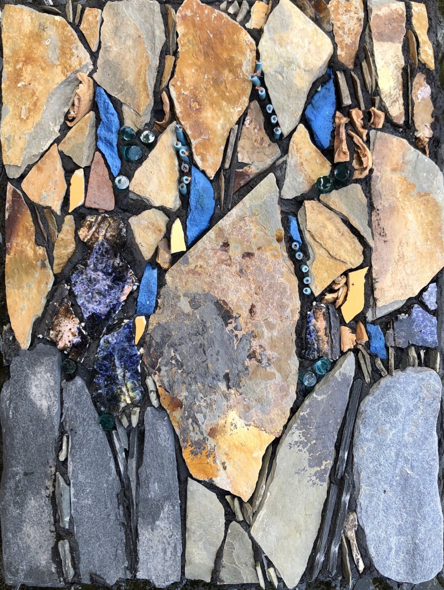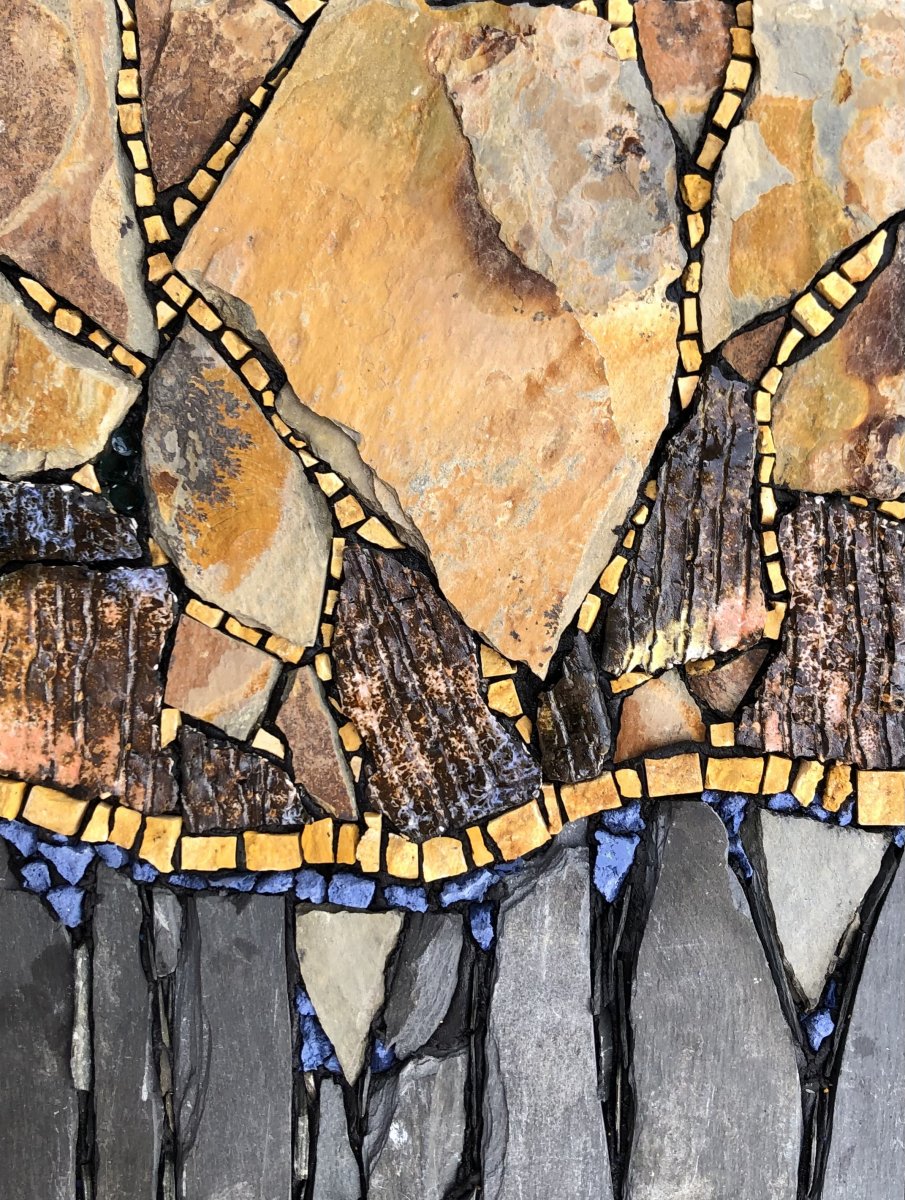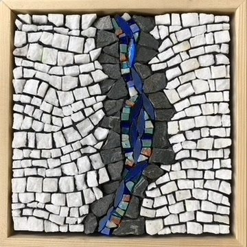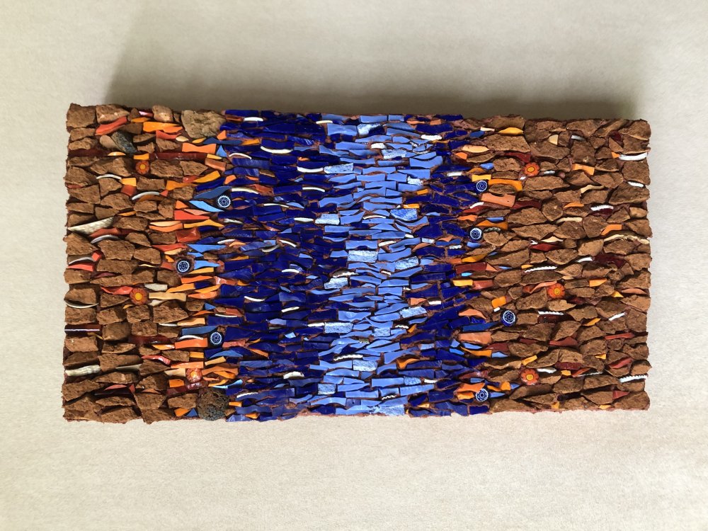 Uden titel. Billede i marmor, skifer, smalti glas, natursten og blå bladguld. 15 x 15 cm. [...]Pris 1700 kr.