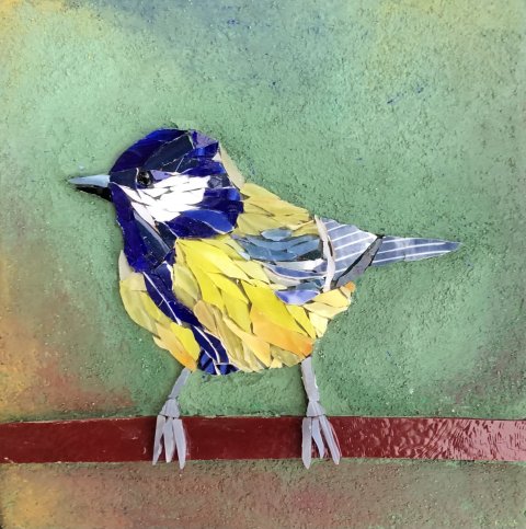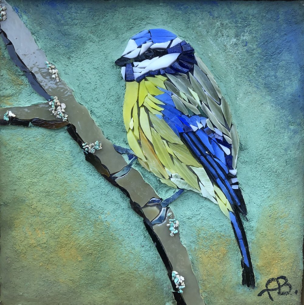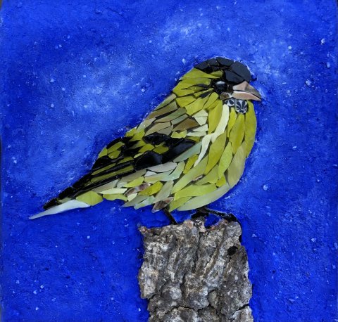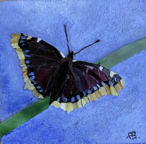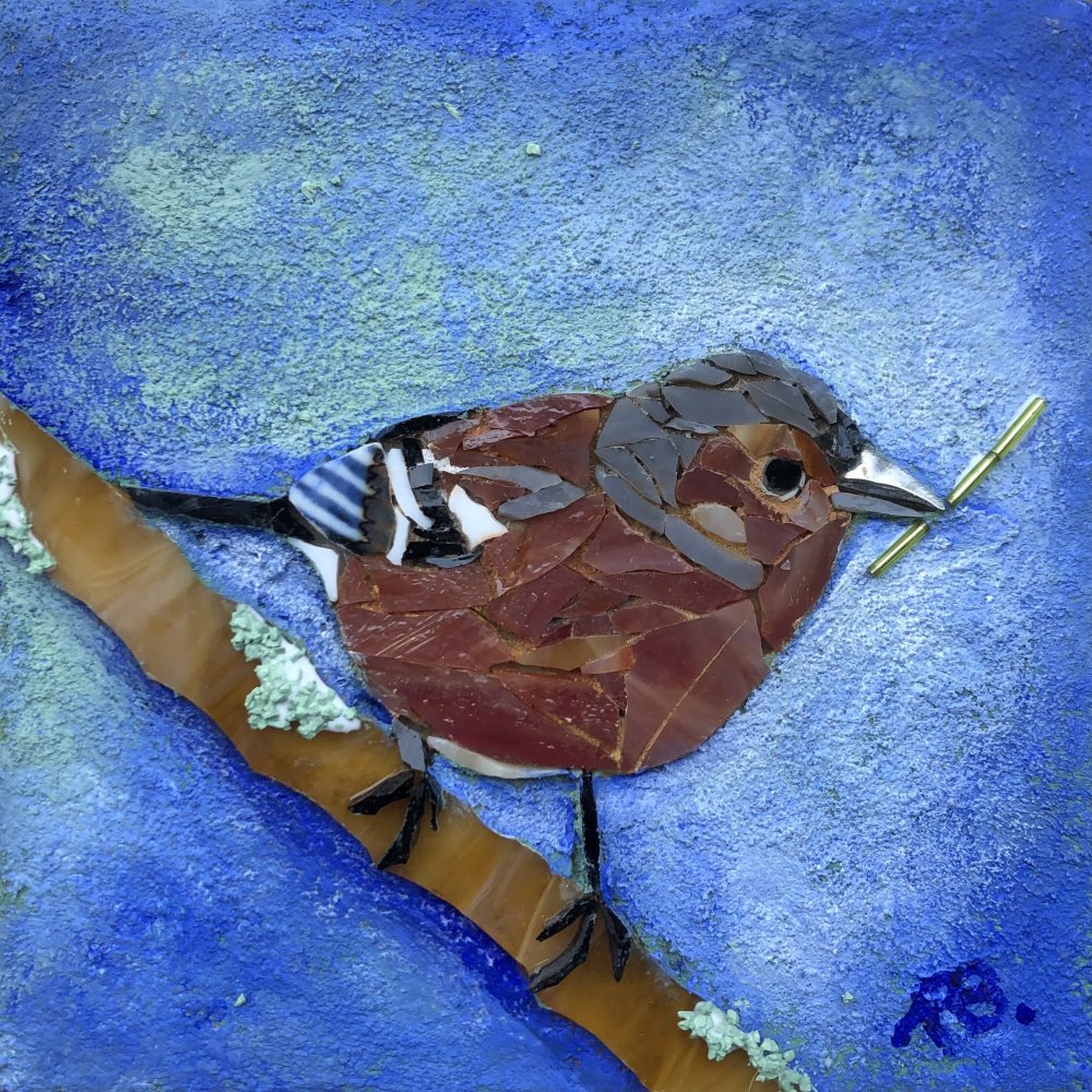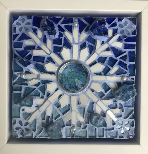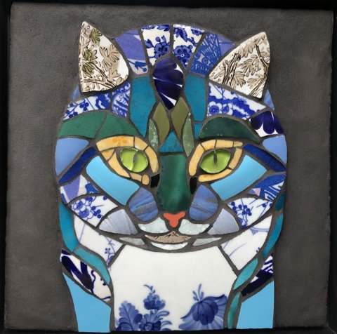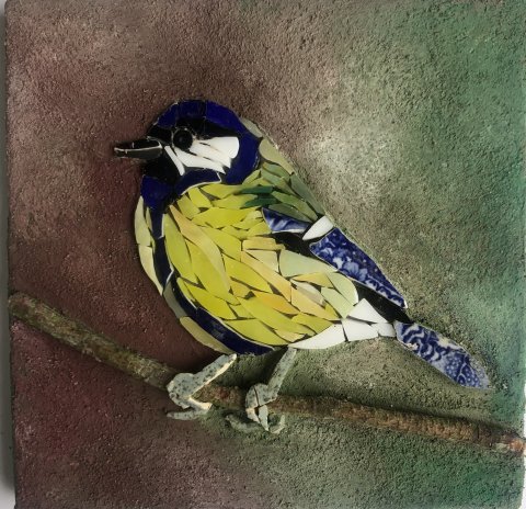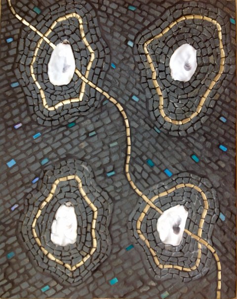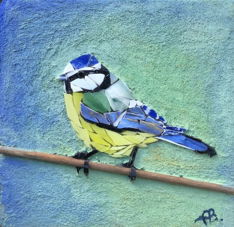 Uden titel. Billede i marmor, skifer, smalti glas, natursten og blå bladguld. 15 x 15 cm. [...]Pris 1700 kr.