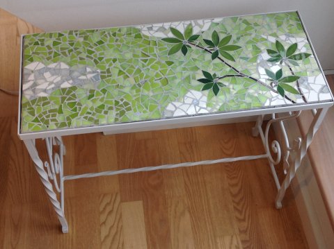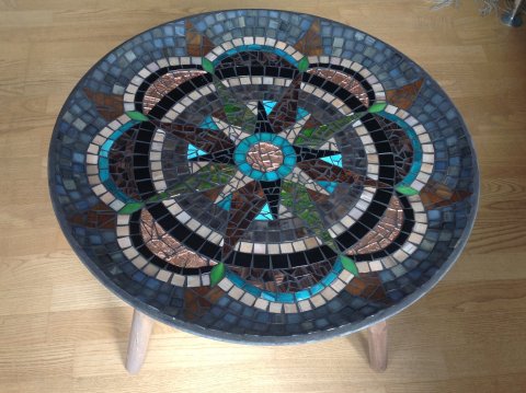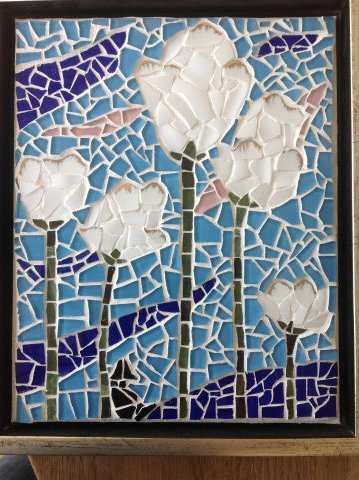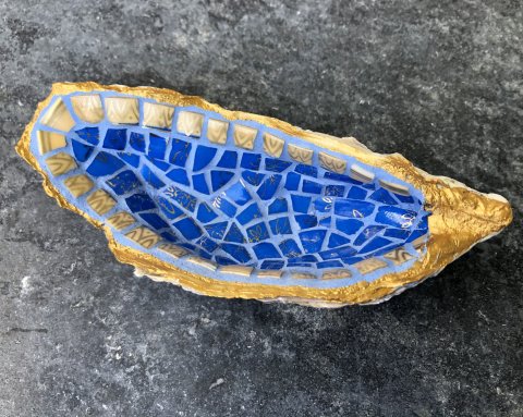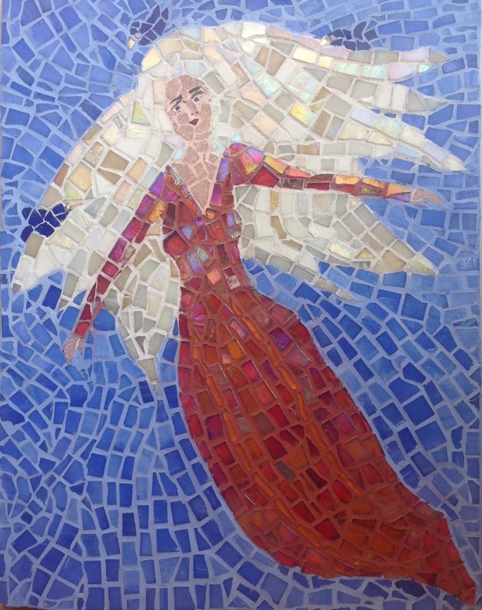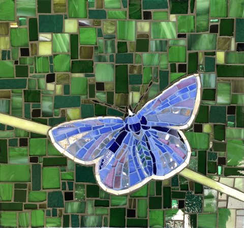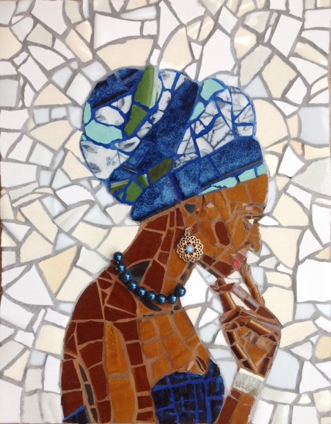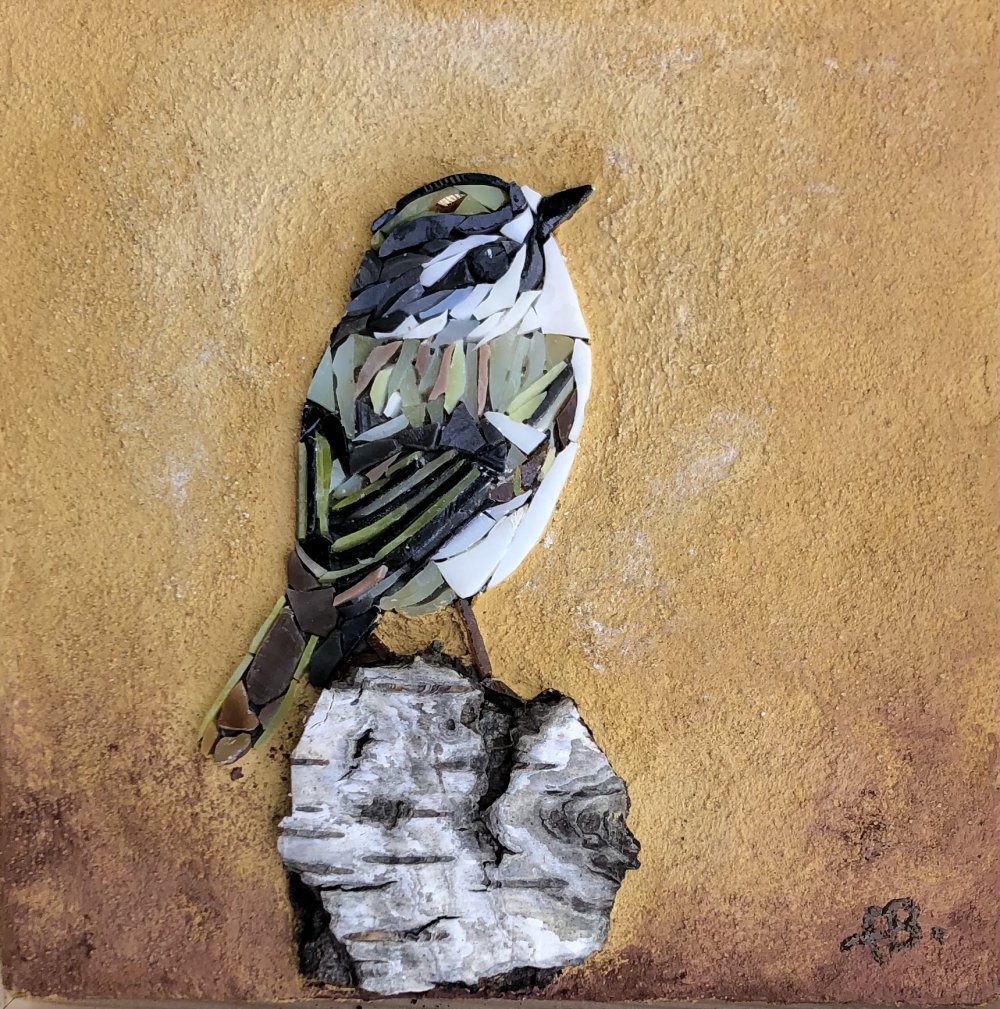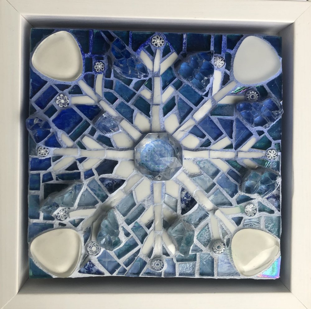 Uden titel. Billede i marmor, skifer, smalti glas, natursten og blå bladguld. 15 x 15 cm. [...]Pris 1700 kr.