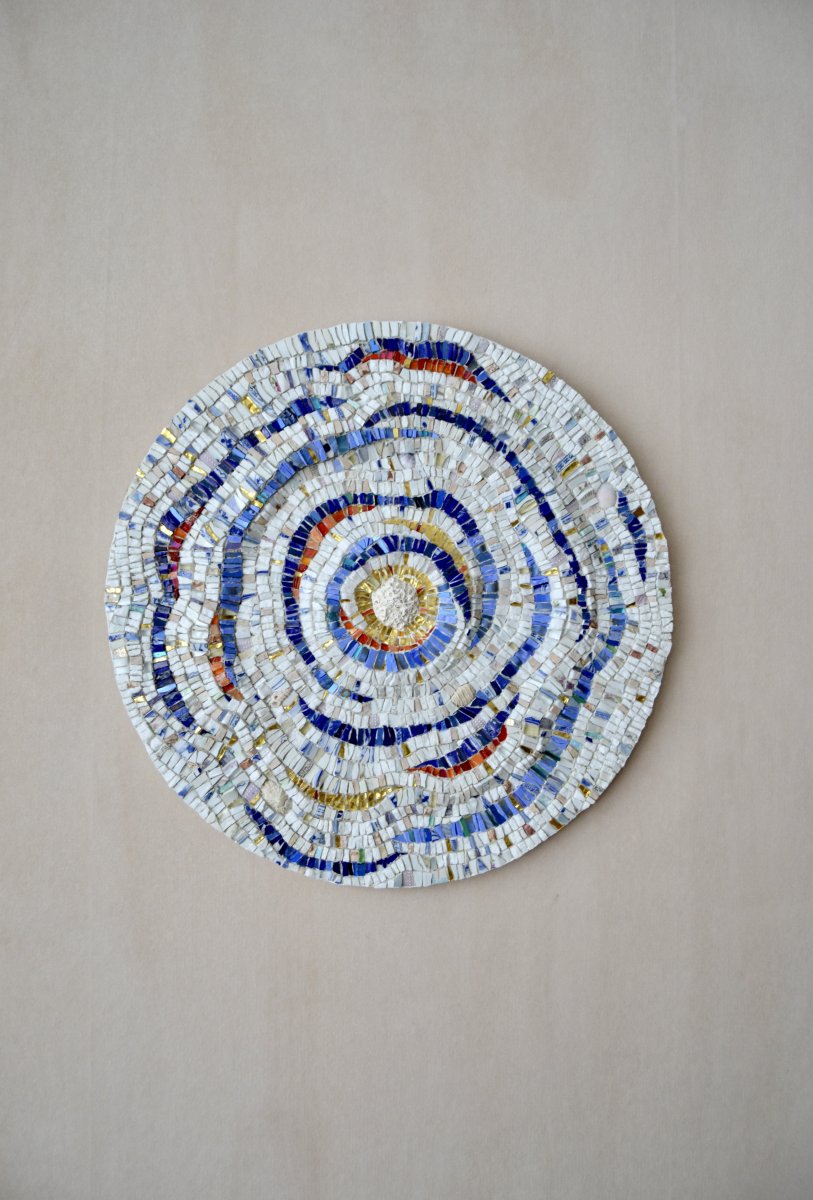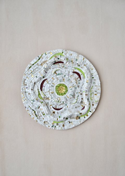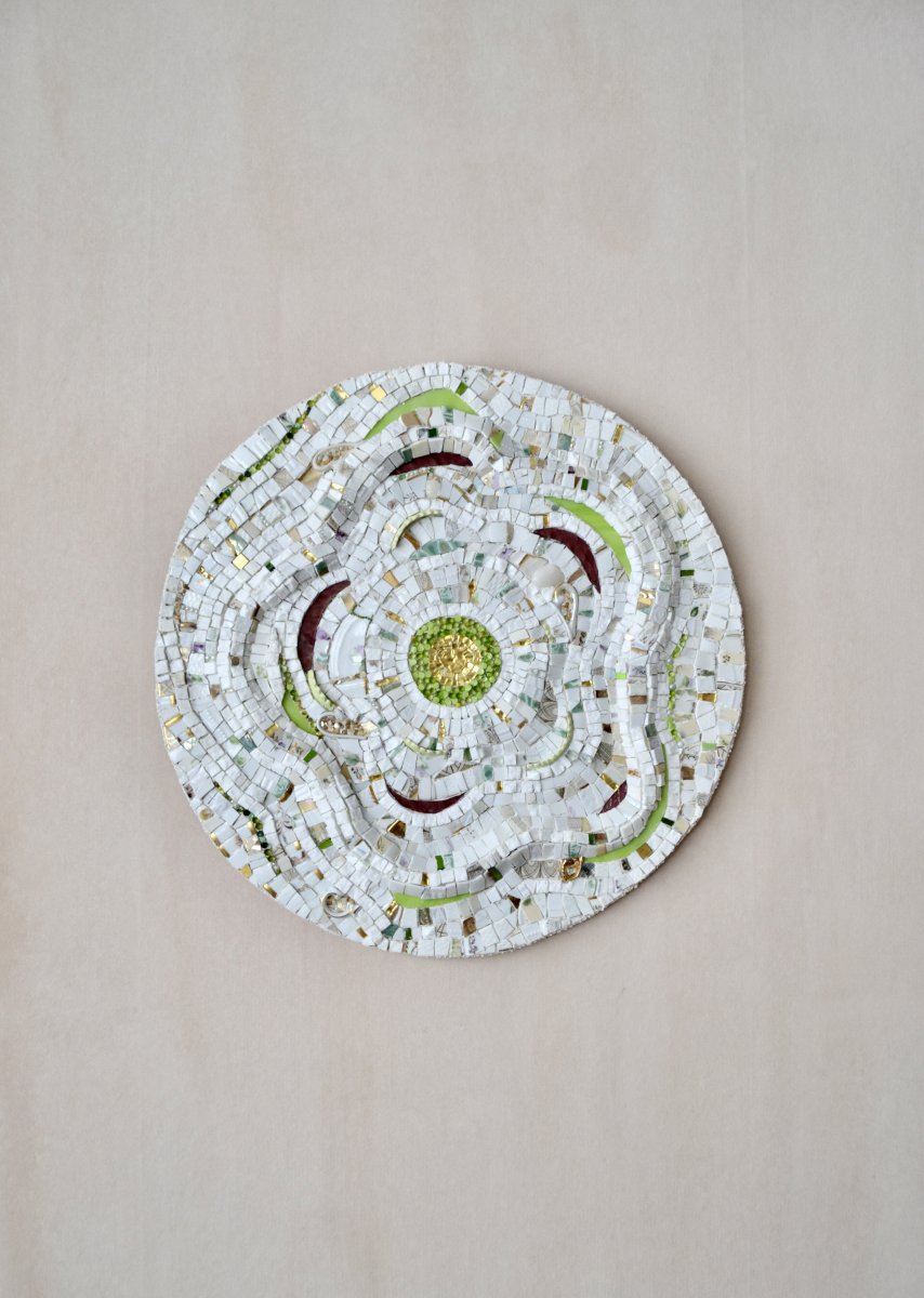 Lys, 2023. Rundt billede i marmor, bladguld, upcycled porcelæn, smaltiglas, natursten, strandskaller. 50 cm i [...]diameter. 18.000 kr.