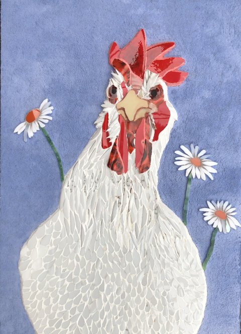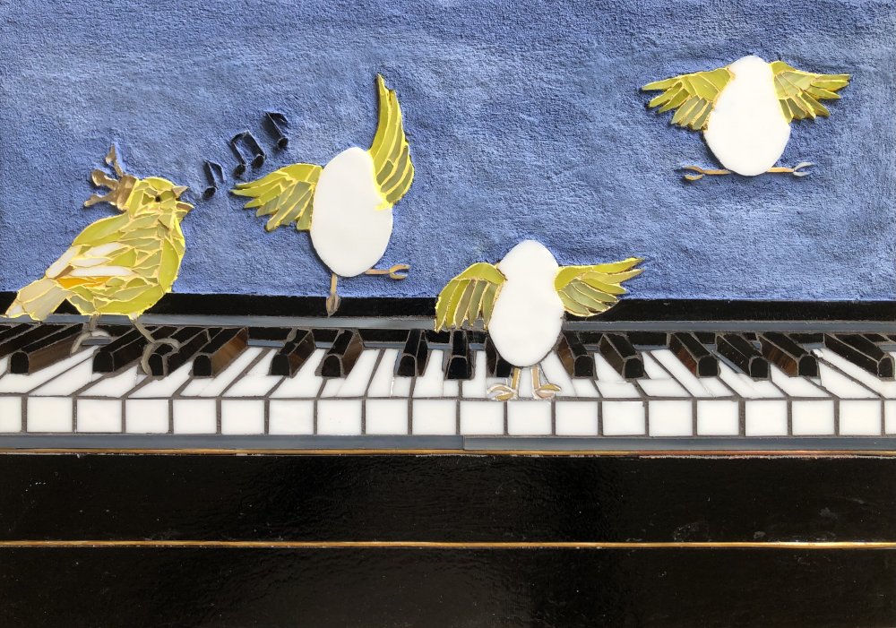 De uudklækkede kyllingers ballet. Inspireret af Mussorgskys Udstillingsbilleder, 5. sats. 2025. Indrammet billede lavet i [...]glas. 30 x 42 cm. 6000 kr.