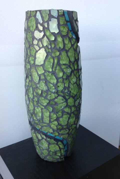 Glasvase, grøn med turkis mønster. Glas fra busstoppested og turkis porcelæn. [...]Højde 30 cm. Solgt