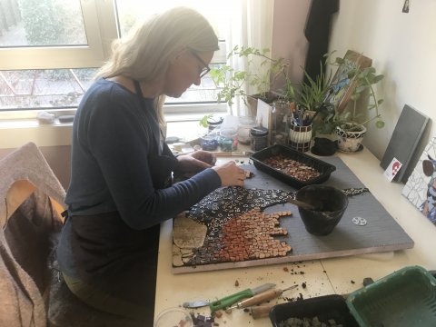 Når jeg arbejder med mosaik, så glemmer jeg ofte tid og sted og rejser indad. Udover at være i det legende, skabende rum, som vi er i alle kunstarter, så er der så meget symbolik i mosaik arbejdet i forhold til det her med at sætte ting sammen på en ny måde, at samle skårene, at gøre noget helt igen. Og det at sætte de mange små brikker sammen giver en ro og en følelse af at blive hel, at blive helet.